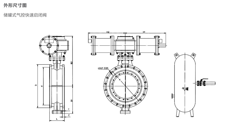储气罐式以钢制储气罐为紧急关阀动力源;正常工况下,压力气源通过电磁阀控制阀门的常速启闭,并在储气罐中储备有足够的压缩空气。弹簧式以压缩弹簧为紧急关阀动力源;正常工况下,压力气源通过电磁阀控制阀门的常速启闭,并压缩弹簧以储备能量。当系统出现危机工况时,电磁阀动作,储气罐中压力气源或压缩弹簧快速释放,控制主阀在0.2~0.8秒钟内实施紧急启闭,实现管路的可靠截止或导通,保护管道主机设备的安全。